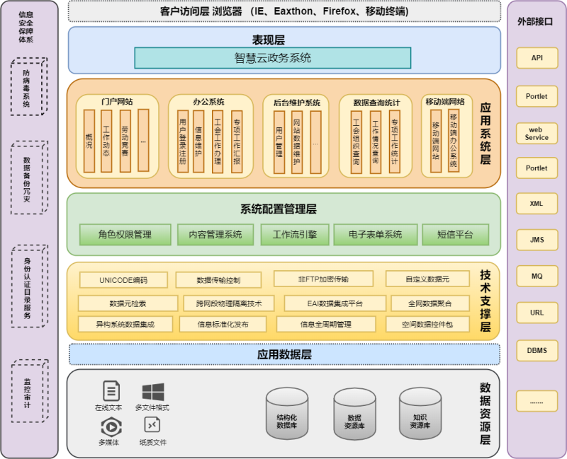 本項(xiàng)目旨在通過集成云計(jì)算、移動(dòng)互聯(lián)、大數(shù)據(jù)等新興技術(shù),迎合目前電子政務(wù)系統(tǒng)向精細(xì)化、智能化、社會(huì)化的智慧云政務(wù)系統(tǒng)發(fā)展的趨勢(shì),解決傳統(tǒng)電子政務(wù)系統(tǒng)較難實(shí)現(xiàn)的跨界業(yè)務(wù)協(xié)同(全景業(yè)務(wù)模式)、異構(gòu)平臺(tái)數(shù)據(jù)訪問、多維度智能表單等關(guān)鍵技術(shù),實(shí)現(xiàn)云端政務(wù)子系統(tǒng)、內(nèi)容管理子系統(tǒng)、工作流平臺(tái)、多維度智能表單系統(tǒng)、跨平臺(tái)數(shù)據(jù)訪問中間件、基于元數(shù)據(jù)的動(dòng)態(tài)指標(biāo)庫(kù)、基于ArcGIS的GIS數(shù)據(jù)調(diào)用中間件等功能模塊,主要由公眾平臺(tái)、政務(wù)平臺(tái)、決策平臺(tái)三大平臺(tái)組成,形成支持智慧政府協(xié)作的新一代智慧云政務(wù)系統(tǒng)。主要內(nèi)容如下: